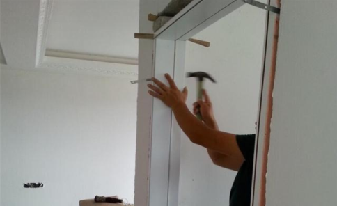 咱們從徒弟的裝載流程中能夠看見,徒弟先是在確認門套的尺寸后,在地面把門套給組裝好。接著再投到門洞里,以及一圈用木片給卡好,以做暫時固定。固然這類裝載方法和其余徒弟并沒有什么差別,門套也全是如此裝載的。但是徒弟接下來的解決,就十分特別了。從下圖中能夠看見,徒弟還在門套雙方根據(jù)等距離的方法,固定了幾個小鐵片。